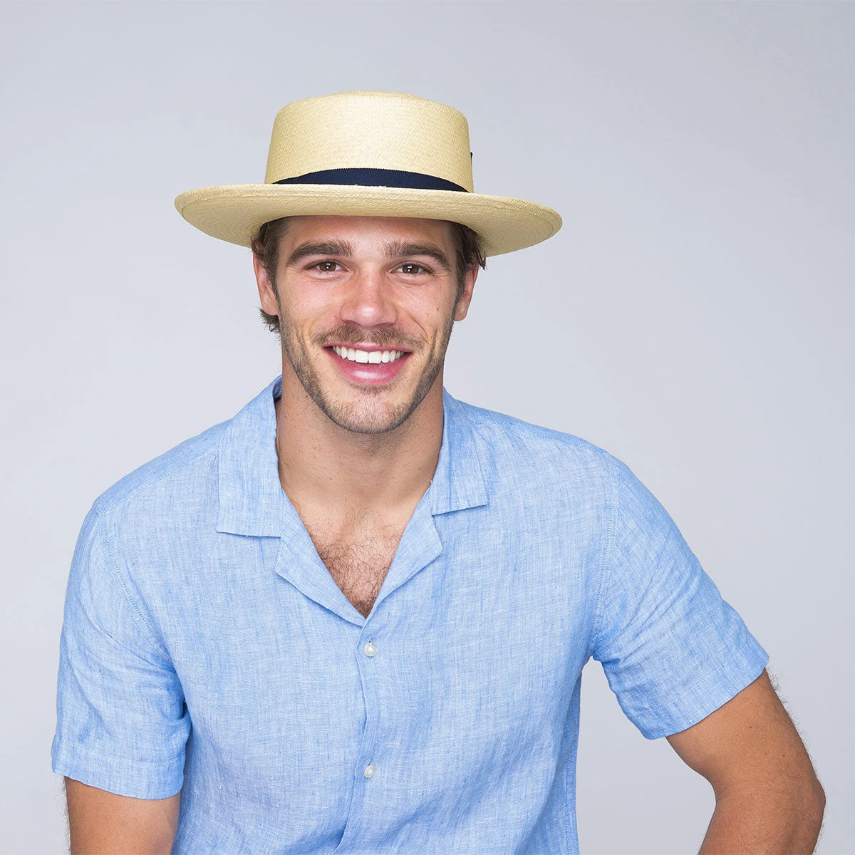 The Creed is a genuine Panama straw hat with a Telescope Crown. The classic pork pie features a medium width hand curled brim accented with a wide Japanese grosgrain ribbon carefully folded with a triangle crosspiece. A matte black dipped flooring nail is tucked behind the ribbon for a signature Bailey touch.