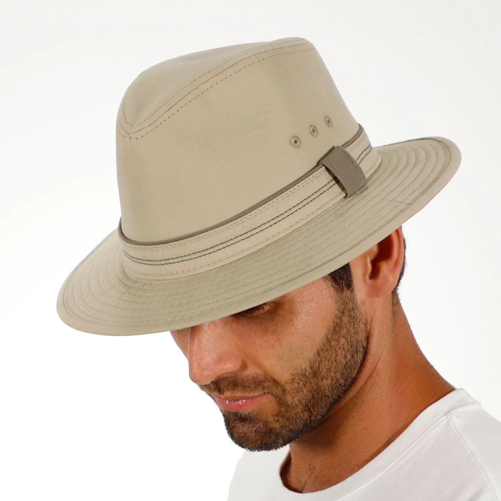 The Safari style hat available in the color choices of khaki and fossil is a great choice for both men and women. It is made from a cool cotton blend with a mesh lining that lets your head and hair breathe. The brim measures two and a half inches and the hat generally looks smart and stylish. Wear it during the spring and summer months while out on a date at night, for going to the office or for a trip to the museum or art gallery. Be sure to match it up with your favorite similarly hued shirt, jacket or pants.