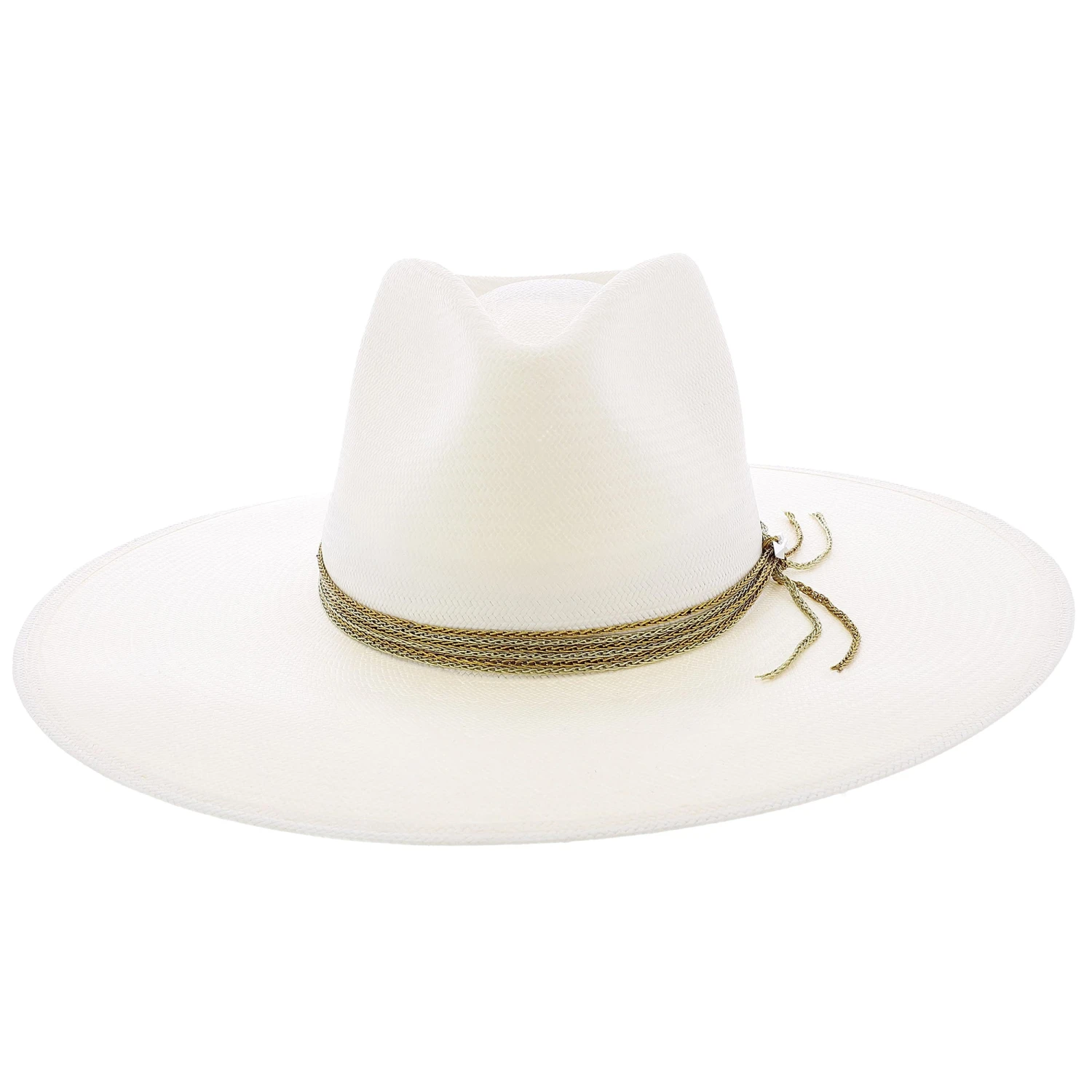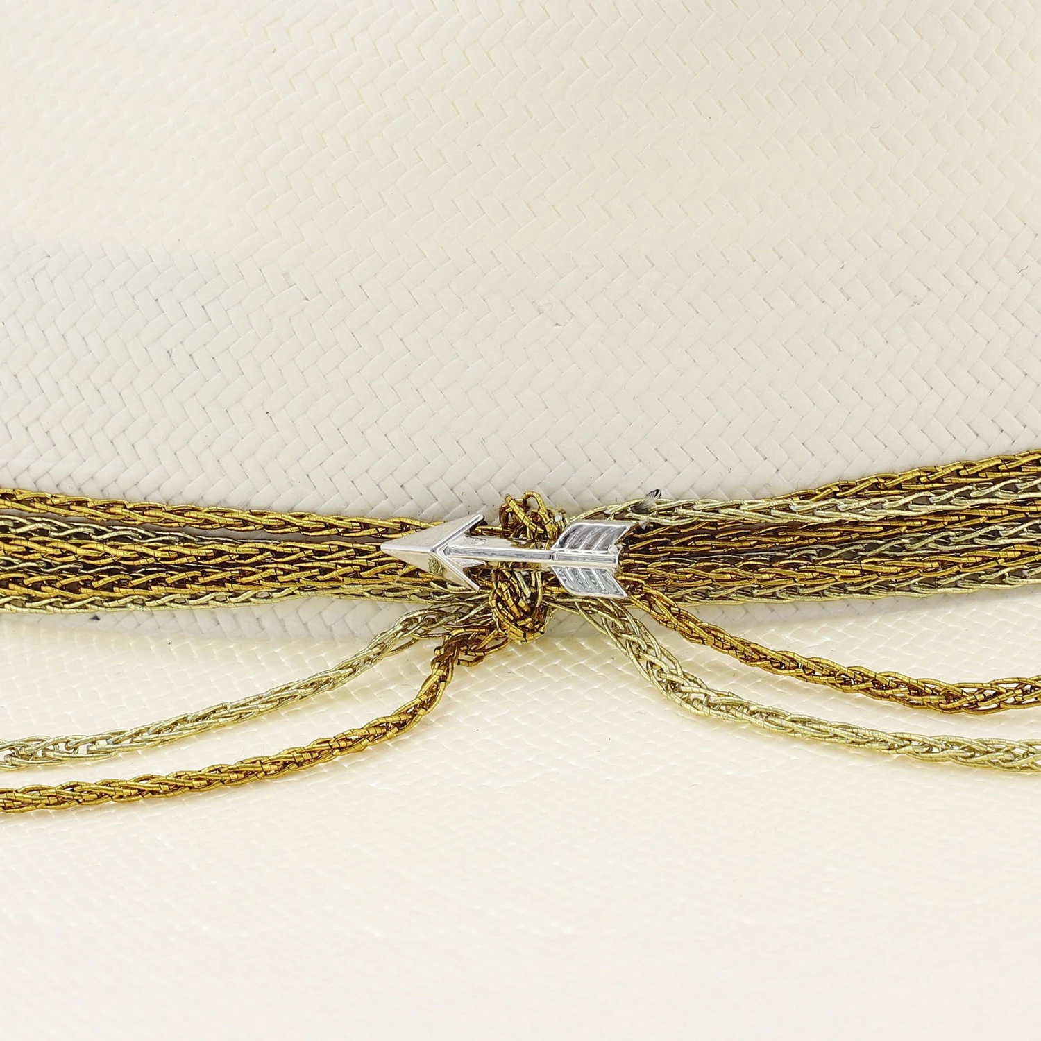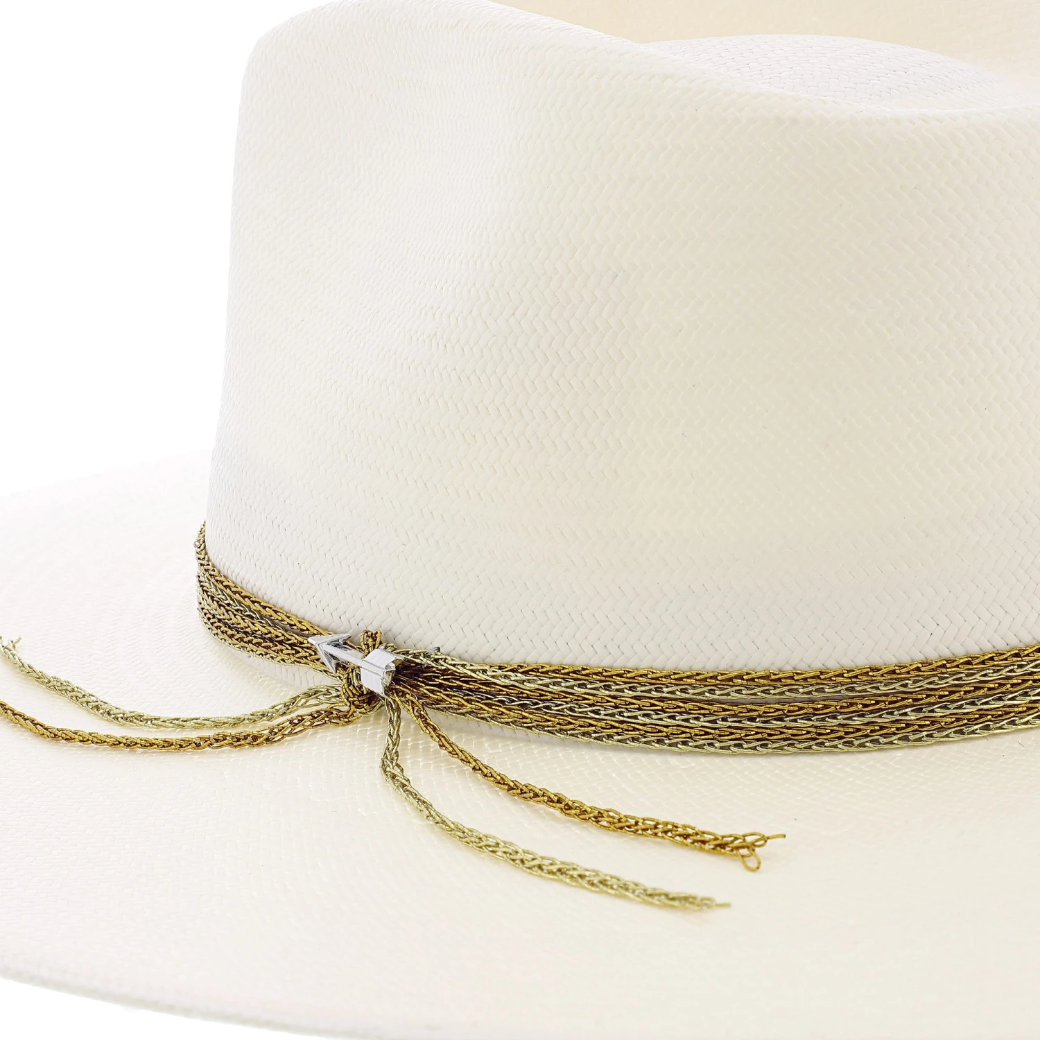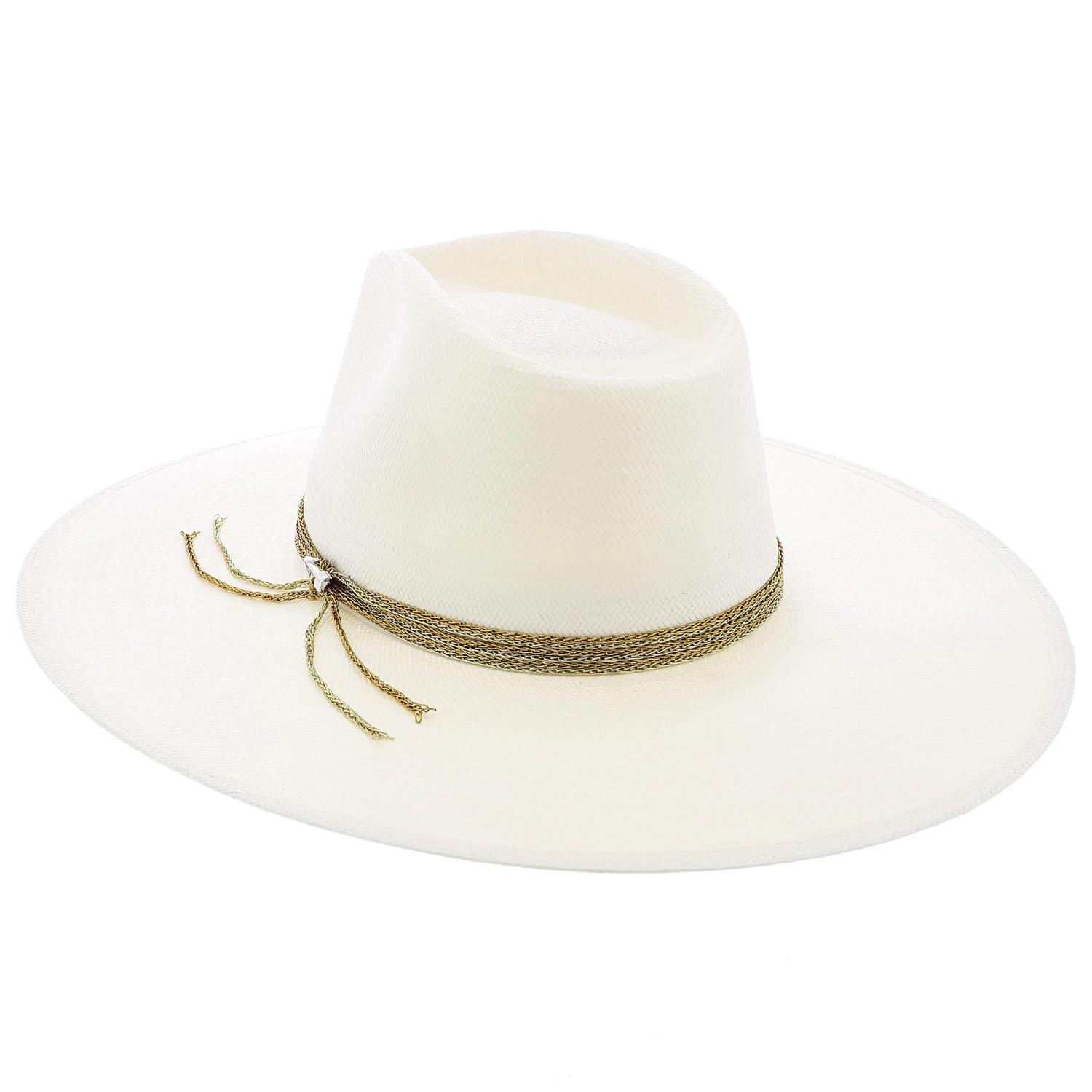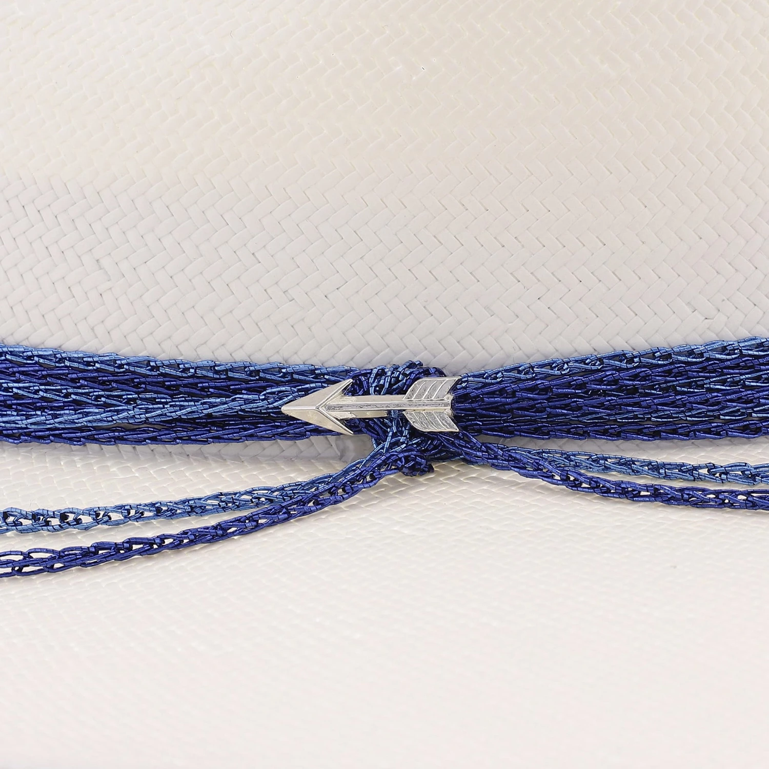 This firm straw wide brim fedora hat has a 4″ brim and a 4″ crown. Available in two exquisite band colors blue and gold. The Hardrock has a beautiful chain link style hat band secured together arrow hat pin which is a perfect compliment to this hat.