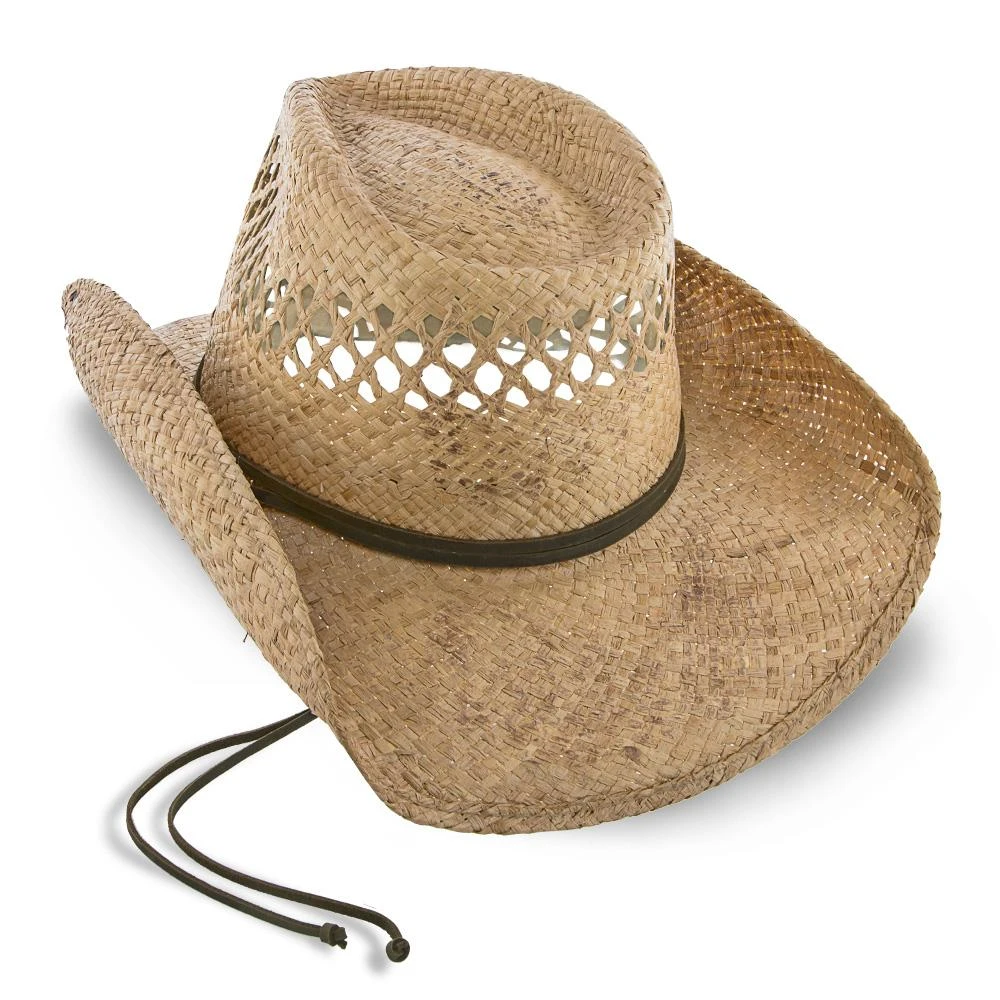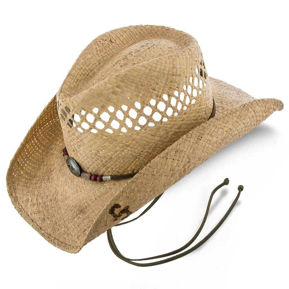 Ride ’em cowboy. But for real, if you’re looking for that rugged Western look, able to rope cattle out on the range, the Stoney Creek Stetson Raffia Straw Cowboy hat (in natural or stained brown) is for you. This stylish straw Stetson cowboy hat has everything you want for that country feel. The stained raffia straw has a worn texture, making it look like it’s already seen days of riding. A teardrop crown and front pinch are complemented by the wide airy gaps purposefully designed into the hat. A shapeable wire brim allows alternative looks. The thin leather hat band includes buckle shaped designs and beads, which leads to a handsome chin strap. A cotton sweatband is very comfortable, completing the thoughtful craftsmanship to the Stetson Stoney Creek hat.