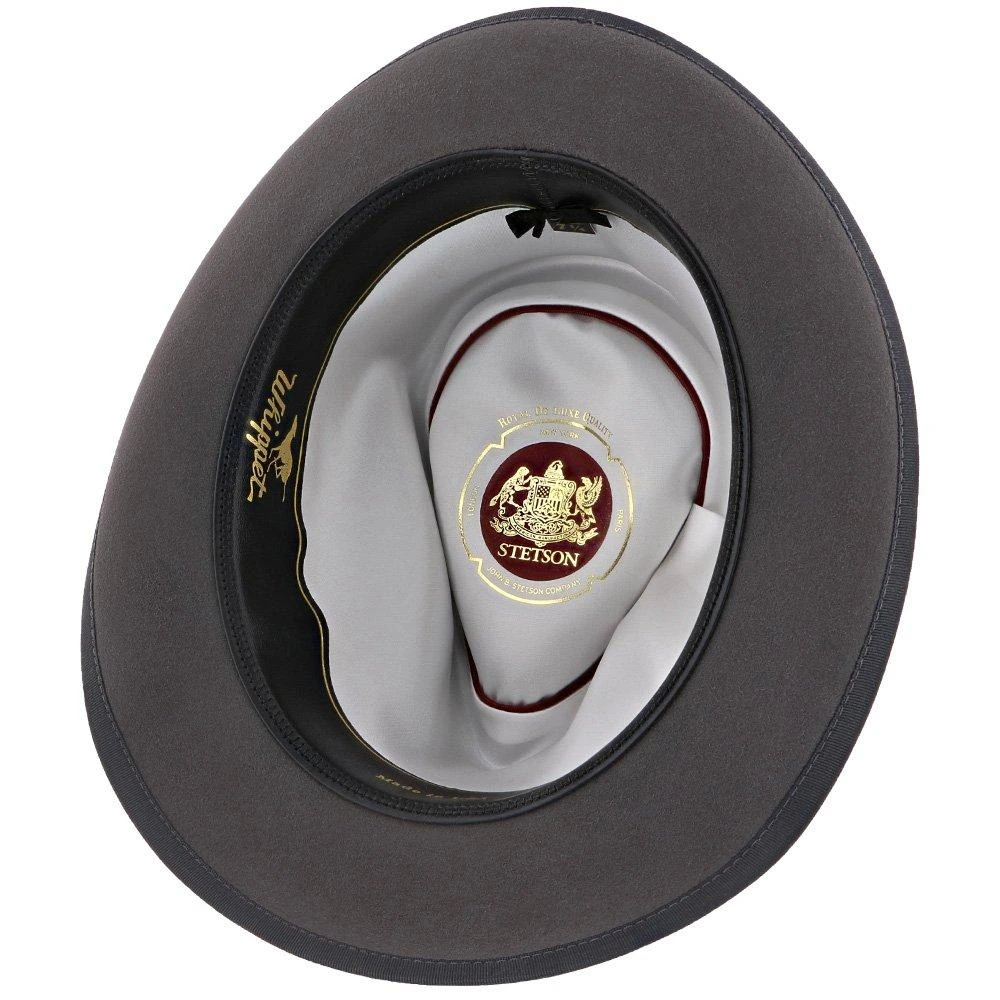 The interior carries the mark of the “royal de luxe quality” of the Stetson brand, and soft sheepskin sweatband. The exterior styling is functional with any wardrobe, featuring classic whippet structure of a grosgrain hat band, optional feather, and Stetson crest pin.